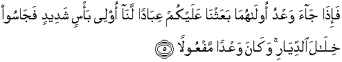 5. “ Maka apabila datang saat hukuman bagi (kejahatan) yang pertama dari kedua (kejahatan) itu, Kami datangkan kepadamu hamba-hamba Kami yang perkasa, lalu mereka merajalela di kampung-kampung . Dan itulah ketetapan yang pasti terlaksana.”