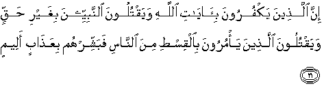 ( 21 ) “Sesungguhnya orang-orang yang kafir kepada ayat-ayat Allah dan membunuh para nabi yang memang tak dibenarkan dan membunuh orang-orang yang menyuruh manusia berbuat adil, maka gembirakanlah mereka bahwa mereka akan menerima siksa yg pedih.”